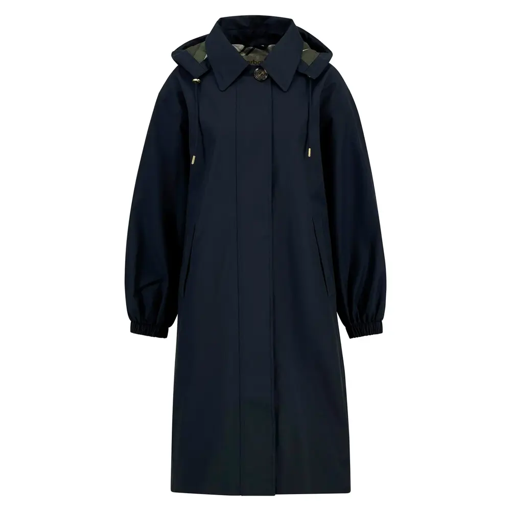 The Barbour Bronagh Waterproof Jacket combines style and practicality. Featuring a detachable hood, adjustable waist drawcord, elastic cuffs and a tartan back neck buggy, it offers a relaxed fit for all-day comfort. Finished with Barbour branding on the left welt pocket.