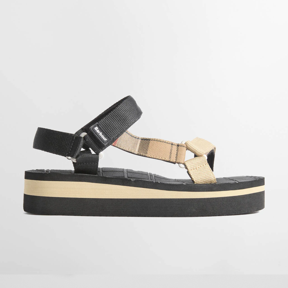 The Barbour Mila Platform Sandals are a bold, summer-ready statement with a sporty twist. Set on an elevated EVA wedge sole, they feature stylish tartan panelling and playful colour mixing for a fresh, contemporary look. A debossed tartan footbed adds signature detail, while the rubberised Barbour logo on the strap completes these standout sandals with a branded touch.