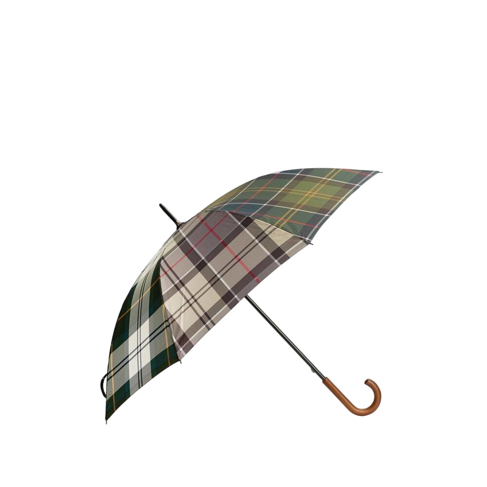 Protect yourself from the unpredictable British weather in style with the Barbour Tartan Umbrella. Detailed with a mixture of three of Barbour's iconic tartans and a logo engraved wooden handle, this style offers a timeless touch to your accessory collection.