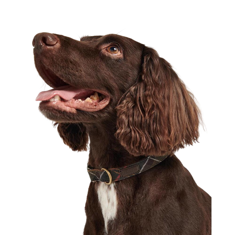 This sophisticated collar is made from durable webbing trimmed in Barbour's iconic house tartan and aged brass-effect hardware. A matching lead is available.