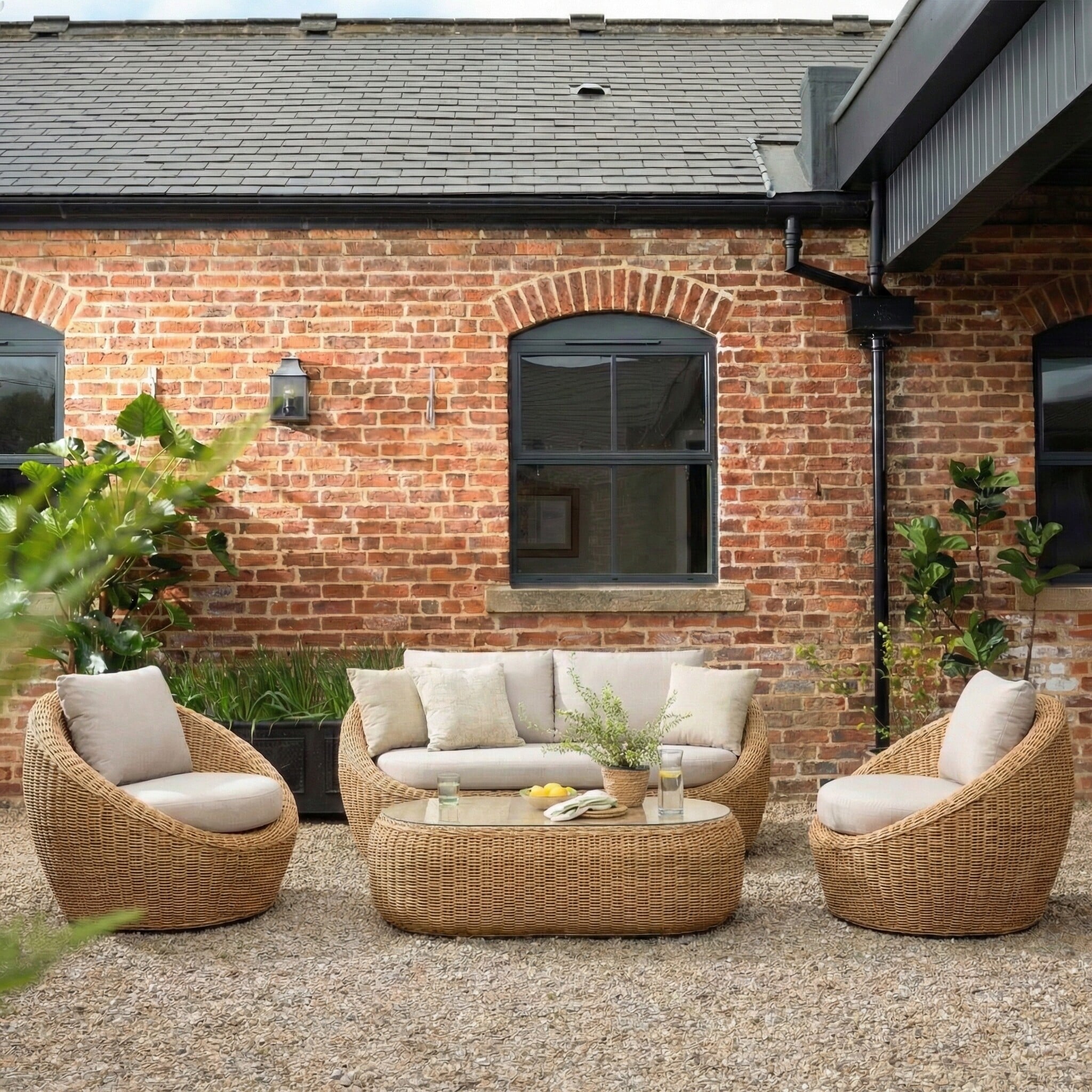Bali Natural Wicker Garden Sofa Set, Seats 4, Slate Cement Top, Aluminium Frame