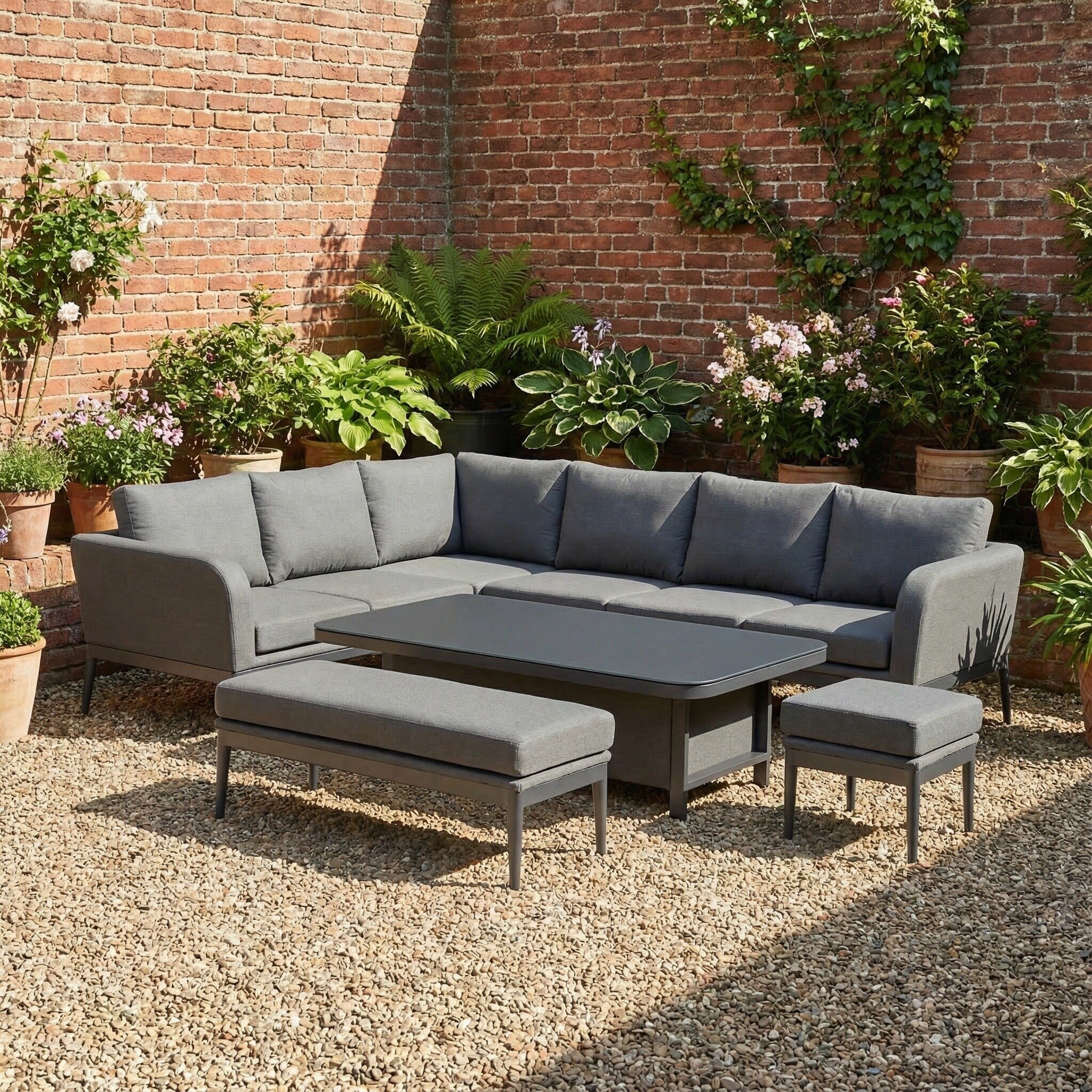 Transform your outdoor area into a luxurious haven with this sophisticated grey 9-seater garden corner sofa set. Featuring two adaptable stools and a versatile rising table, this set is a perfect blend of comfort and style. The expansive sofa is adorned with plush cushions that promise a relaxed lounging experience, while the innovative rising table easily transitions between dining and coffee heights, accommodating your every need. Whether you're hosting a gathering or enjoying a quiet moment with family and friends, this durable set brings modern elegance and practical functionality to your garden, patio, or terrace. Elevate your outdoor living space with this stylish and inviting furniture ensemble.