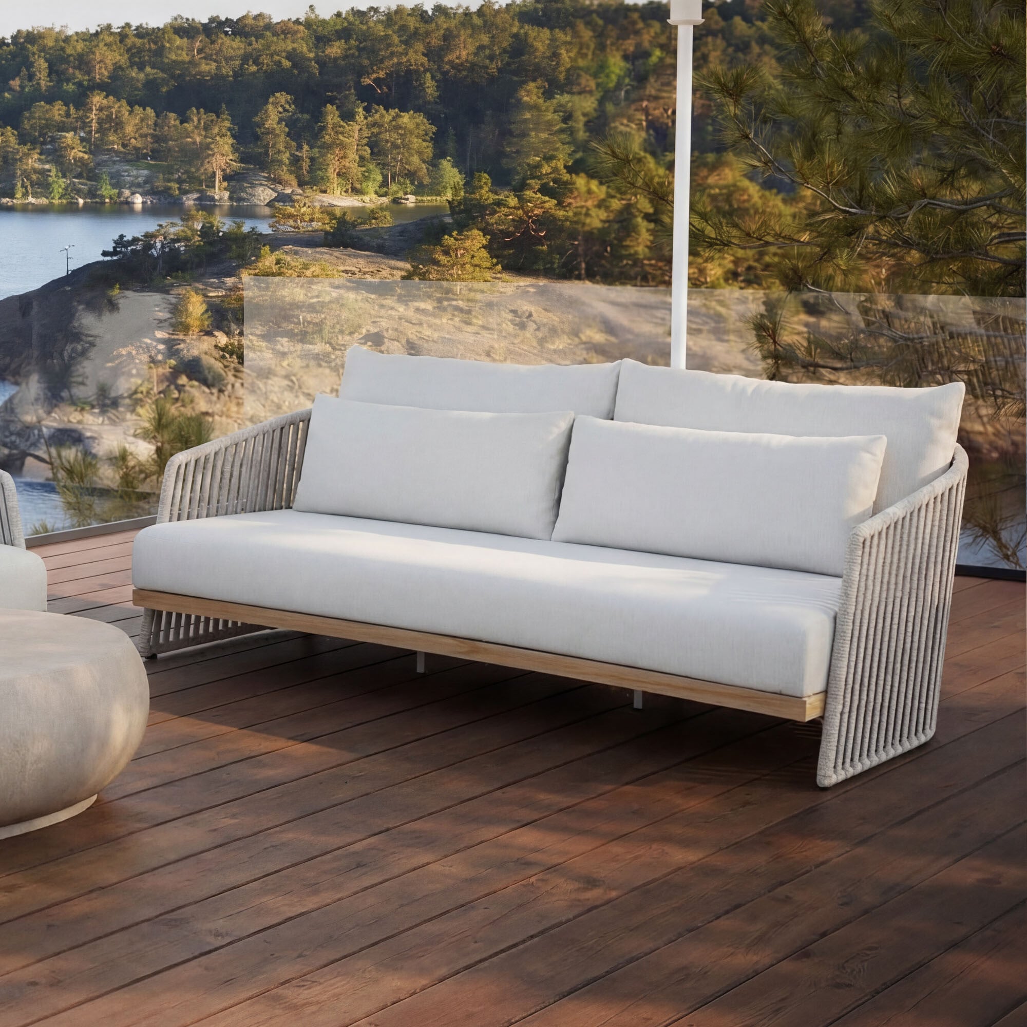 Experience ultimate relaxation with this chic grey garden sofa, expertly crafted to combine comfort and longevity. The robust aluminum frame introduces a contemporary flair, perfectly complemented by the inviting warmth of the teak seat, which exudes natural elegance. The sofa's sophisticated rope weave detailing adds a layer of refined texture, striking a harmonious balance between style and sophistication. Whether basking in the sun on a bright afternoon or savoring the tranquility of a serene evening outdoors, this sofa provides the perfect retreat, infusing your patio or garden with effortless elegance and comfort.