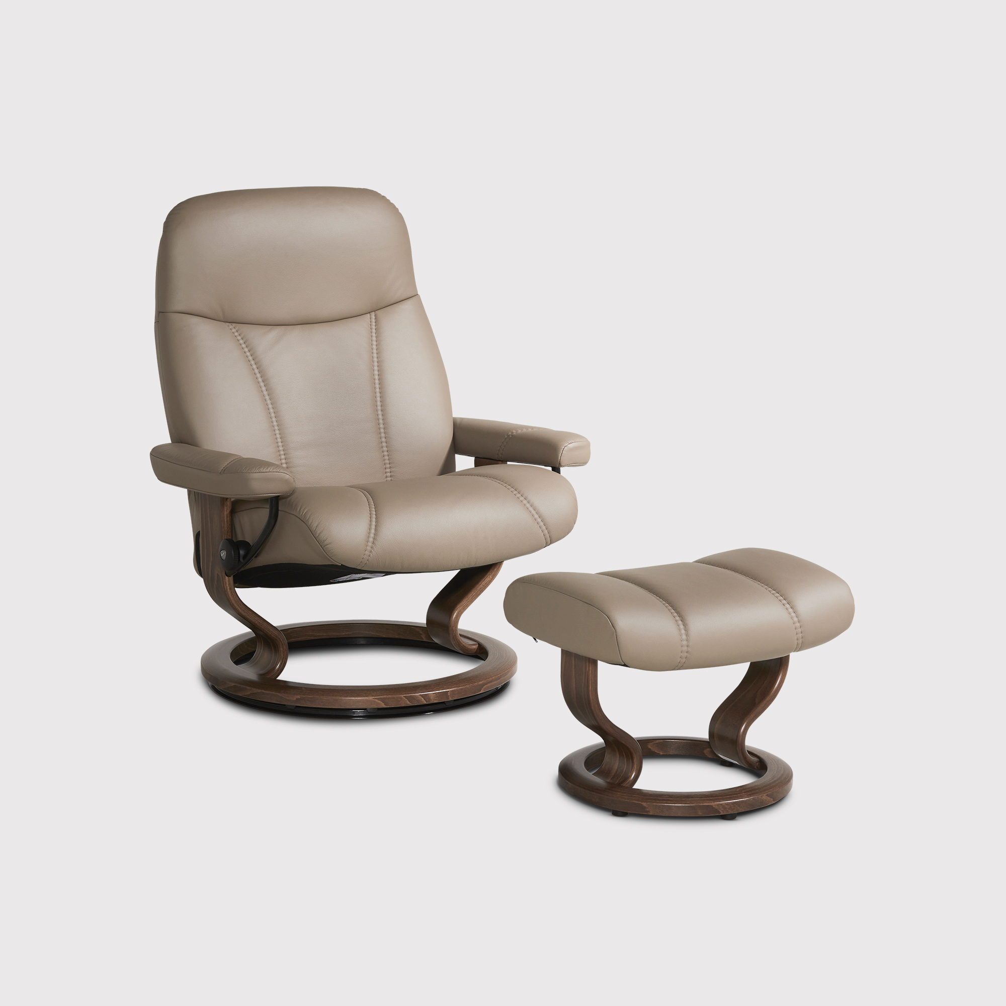 Experience the epitome of relaxation with the Large Consul Classic Base Brown Recliner Chair and Footstool. This luxurious recliner offers exceptional neck and lumbar support, thanks to its innovative Plus™ system, ensuring you feel comfortable whether you're sitting upright or fully reclined. With just a gentle hand motion, you can activate the sleep function for a serene and restful nap, enhancing your relaxation experience.