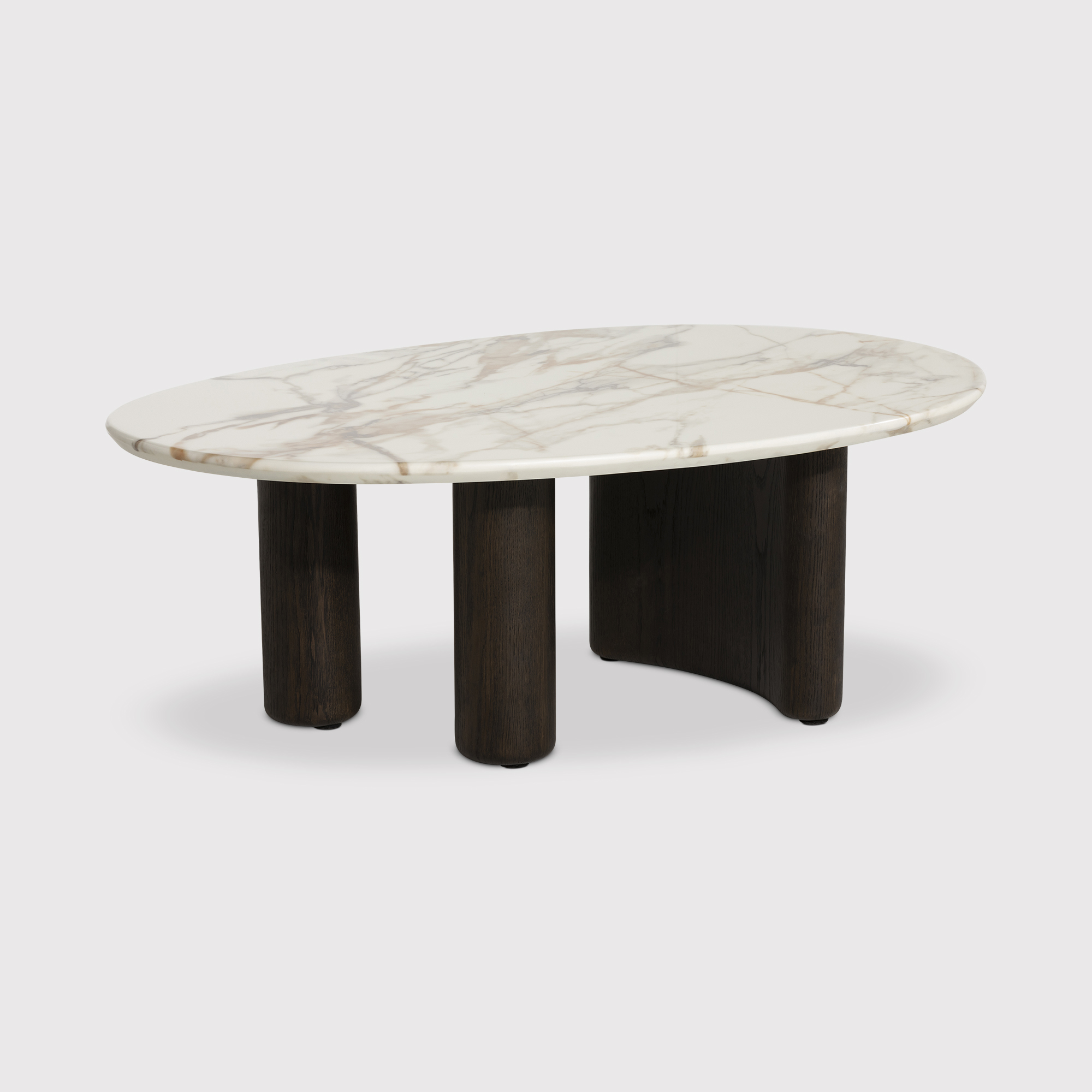 Elevate your living space with a touch of elegance and contemporary charm through this distinctive coffee table. The ceramic marble-effect top not only exudes style but also ensures lasting durability, creating a perfect balance between aesthetics and function. This exquisite surface is supported by three unique brown engineered wooden legs: one gracefully curved and two sleek cylindrical, offering a harmonious blend of artistry and stability. Ideal for modern living rooms, this table seamlessly merges sophistication with practical use, ensuring it becomes a captivating focal point in your home.