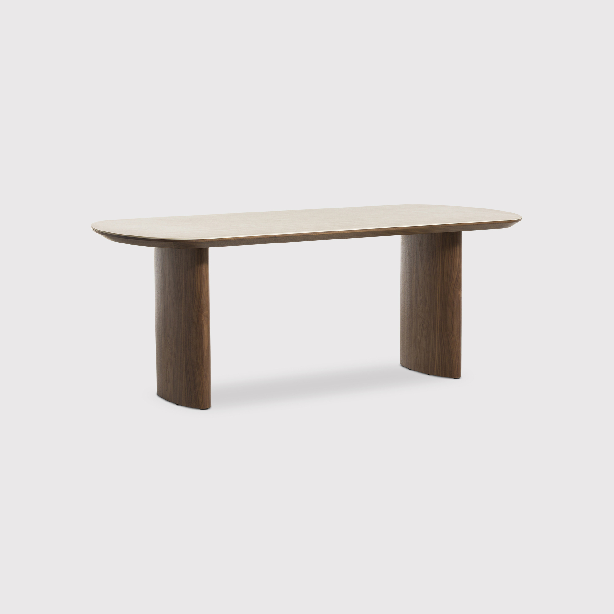 Elevate your dining experience with this exquisite table, designed to bring a touch of luxury to your home. Its stunning ceramic top is complemented by a base crafted from engineered wood, adorned with a natural walnut veneer, creating a harmonious blend of textures. This striking juxtaposition of smooth stone and warm wood infuses any room with a contemporary, sophisticated ambiance. Built for durability and practicality, this table offers an ideal surface for meals and social gatherings. Perfectly suited for modern dining rooms, it seamlessly merges style with functionality, offering a welcoming focal point where family and friends can gather in comfort and elegance.