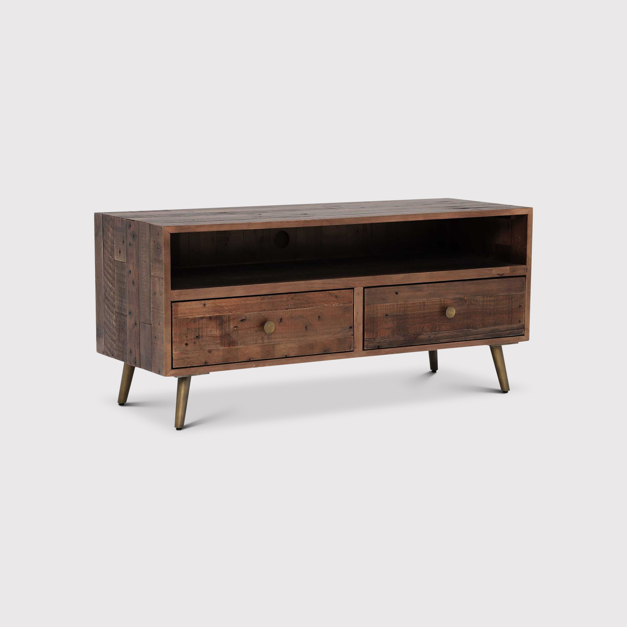 Modi Reclaimed Wood Lowline TV Cabinet with 2 Drawers, Rustic Saddle Tan with Brass Legs
