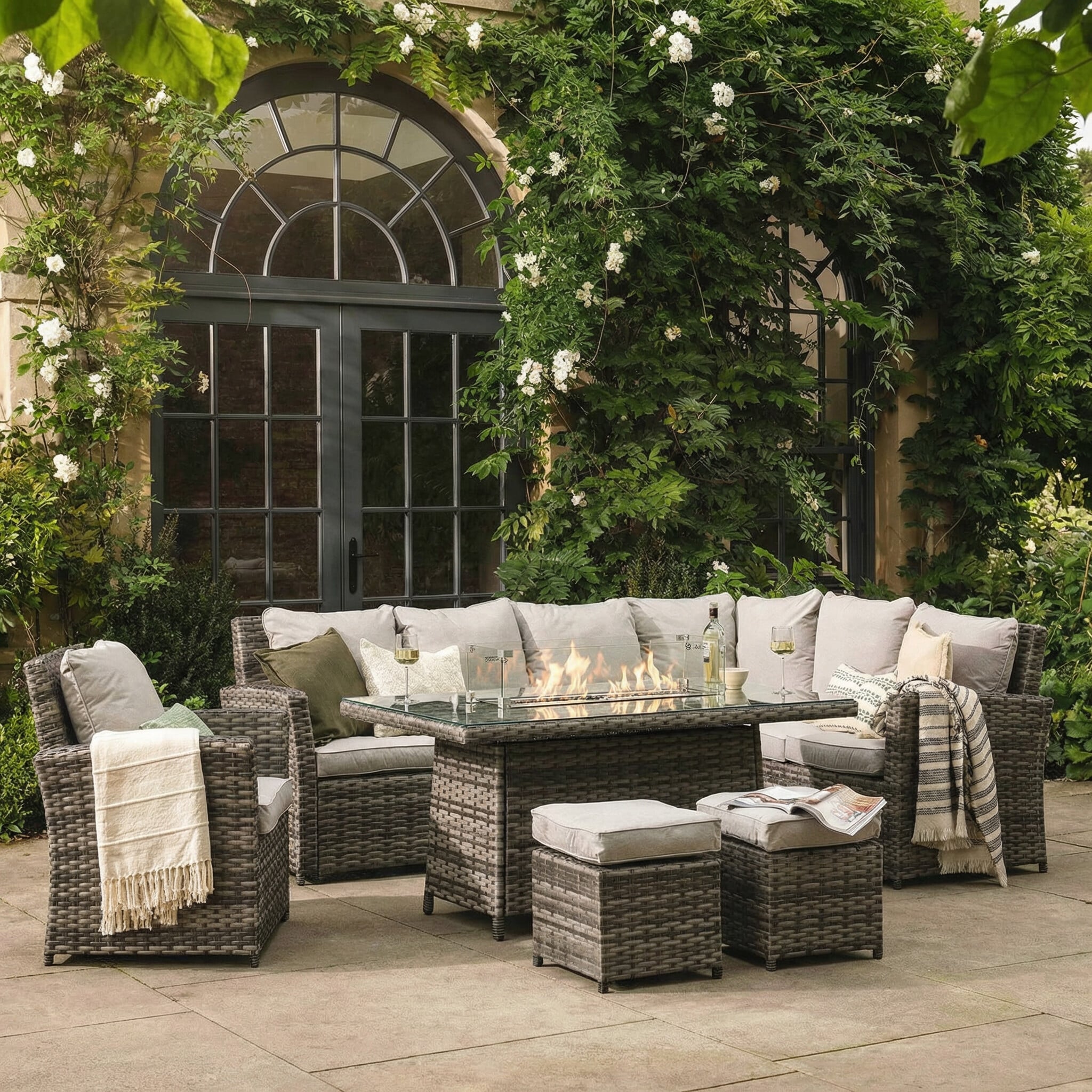 Provence Rattan Corner Sofa With Fire Pit Table and Garden Chairs, Seats 6, Grey Rattan and Grey Fabric
