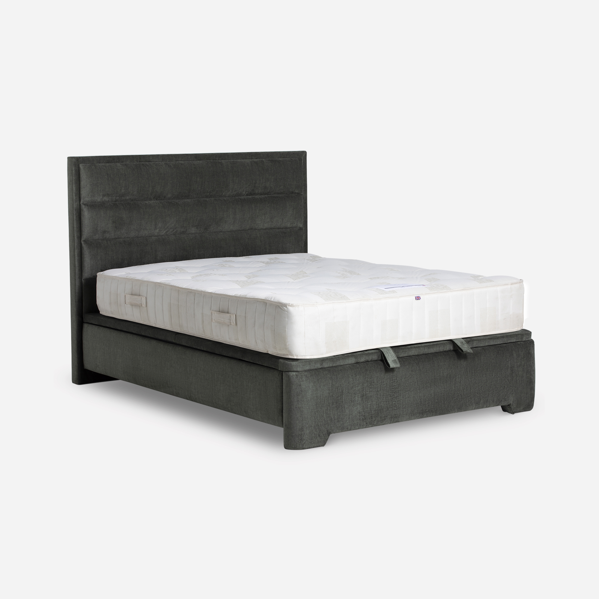 - Padded horizontal panel stitched headboard with slim border. Spacious ottoman storage which includes a handy hydraulic assisted lift up system and dual lift straps for easier lifting.
