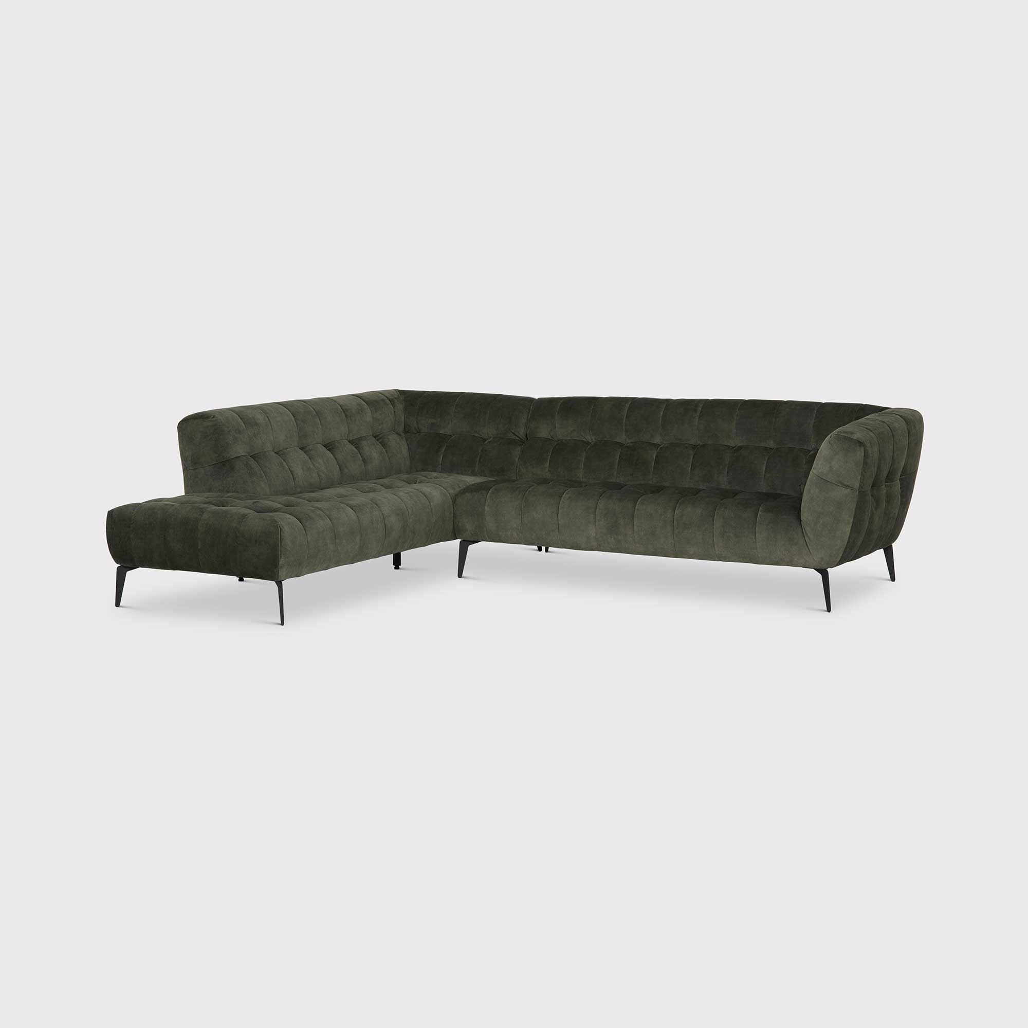 Indulge in the ultimate luxury experience with the Dark Green Velvet Corner Sofa Left Facing. Encased in irresistibly soft velvet, this contemporary masterpiece beautifully marries modern design with timeless comfort. The sofa boasts generously filled cushions, adorned with buttonless tufting, ensuring a sumptuous feel and enduring support.