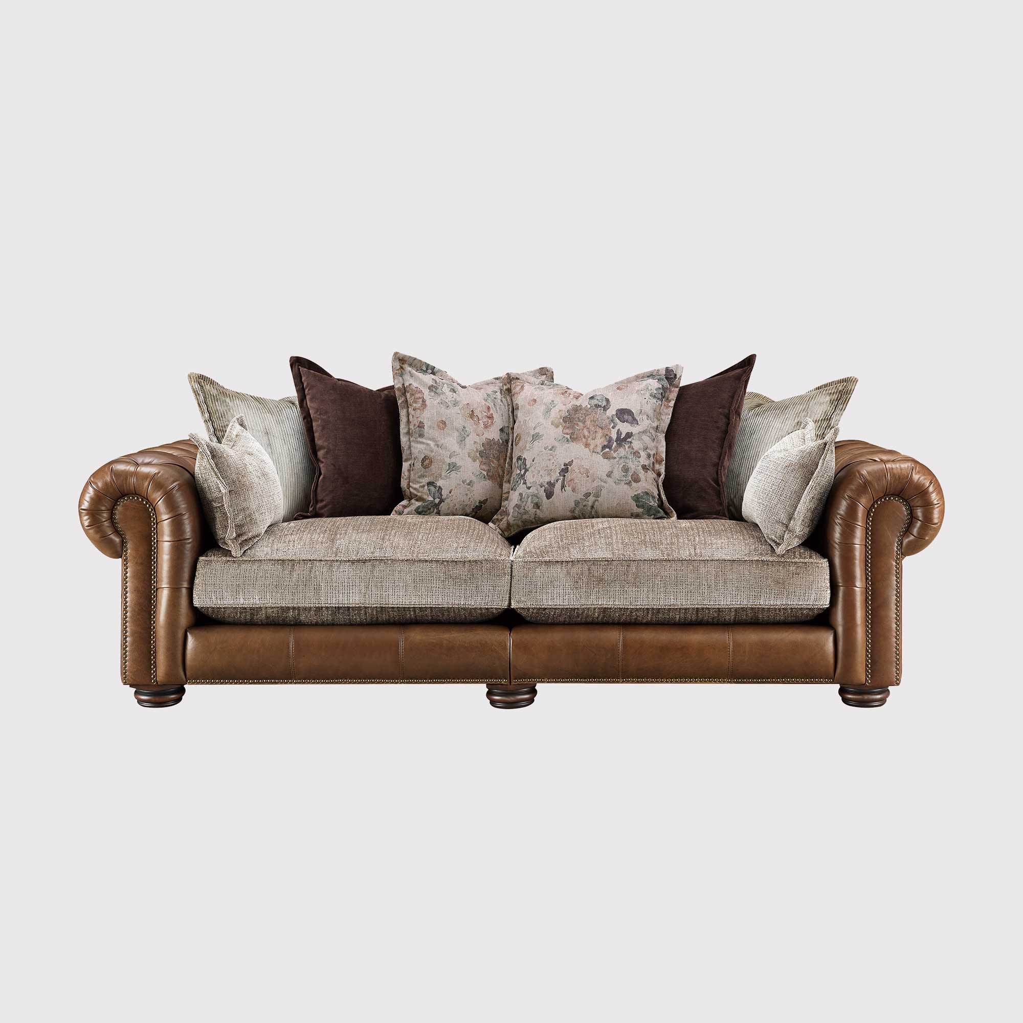 Taunton Brown Leather 3.5 Seater Sofa with Fabric Seat Cushions, In Roaming Valley body, Antique Brass Studs