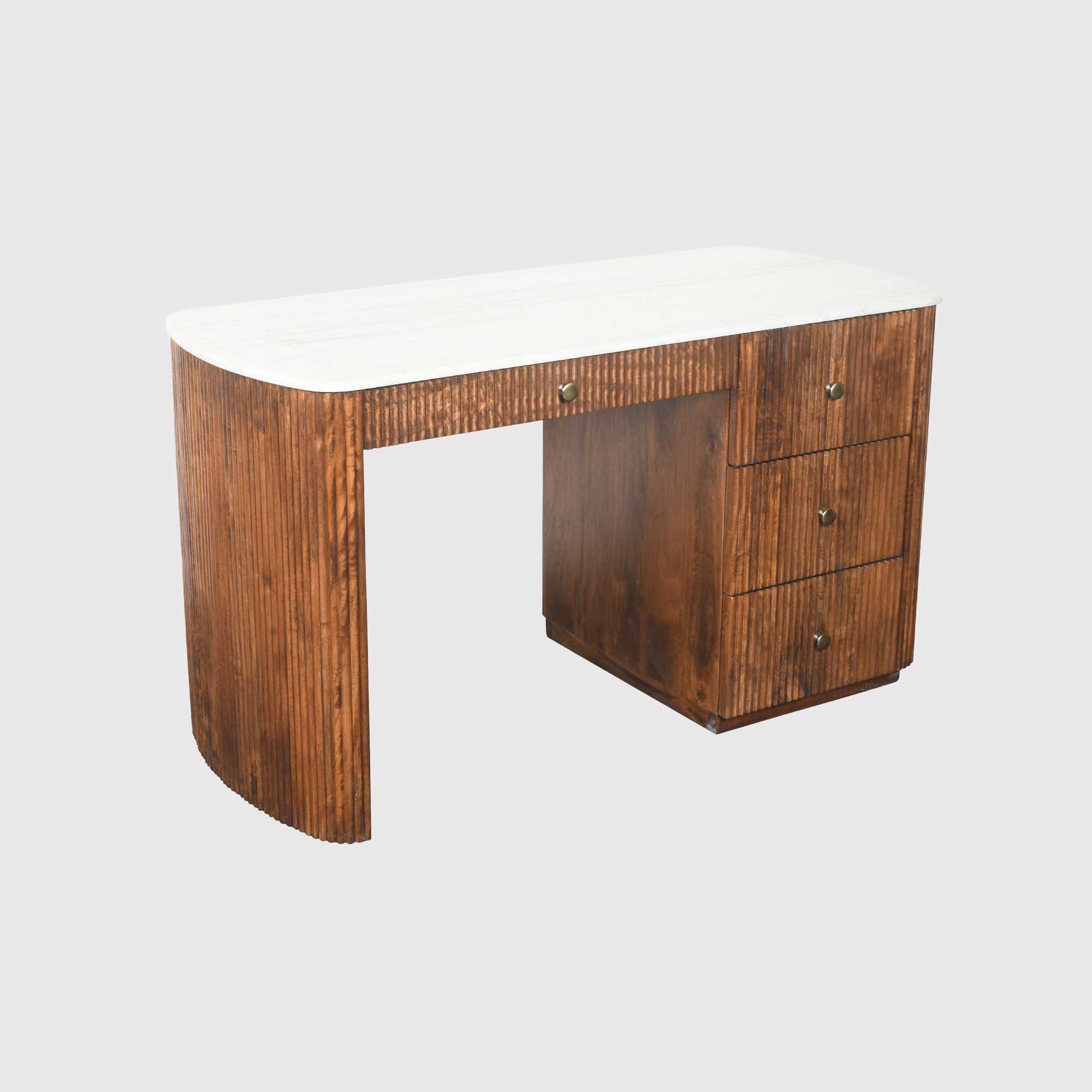 Tasso Fluted Mango Wood Office Desk With White Marble Top, Mango Fluted Wood and White Marble Top