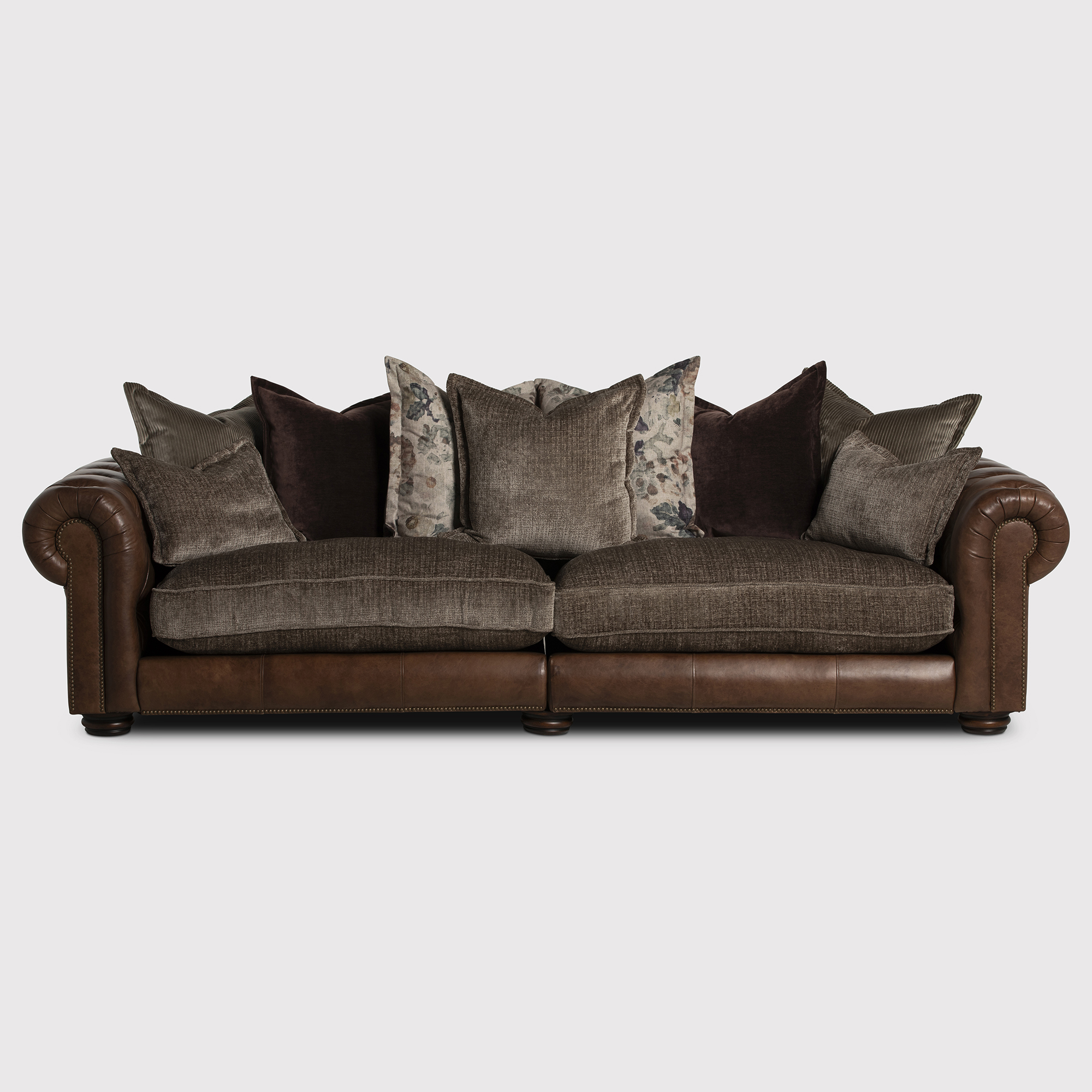Taunton Brown Leather 4 Seater Sofa with Fabric Seat Cushions, In Roaming Valley body, Antique Brass Studs