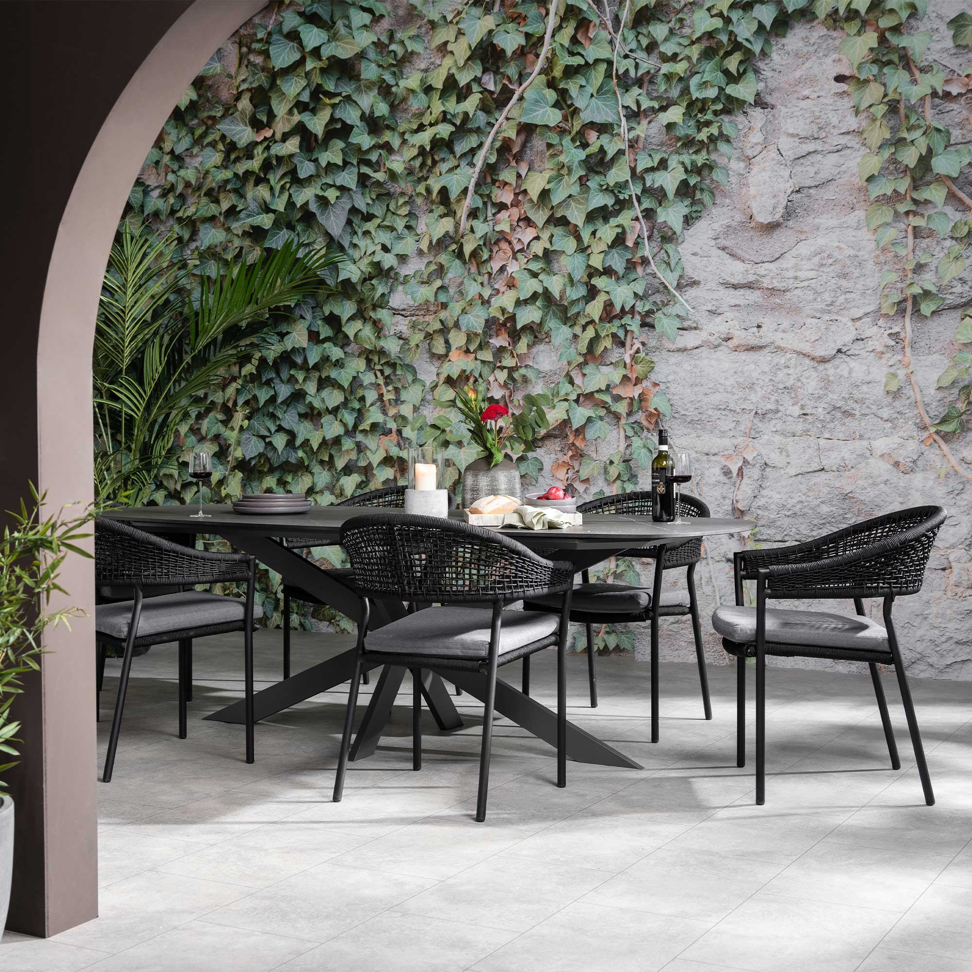 Torino Dark Grey Ceramic Garden Dining Table and Black Rope Chairs, Seats 6