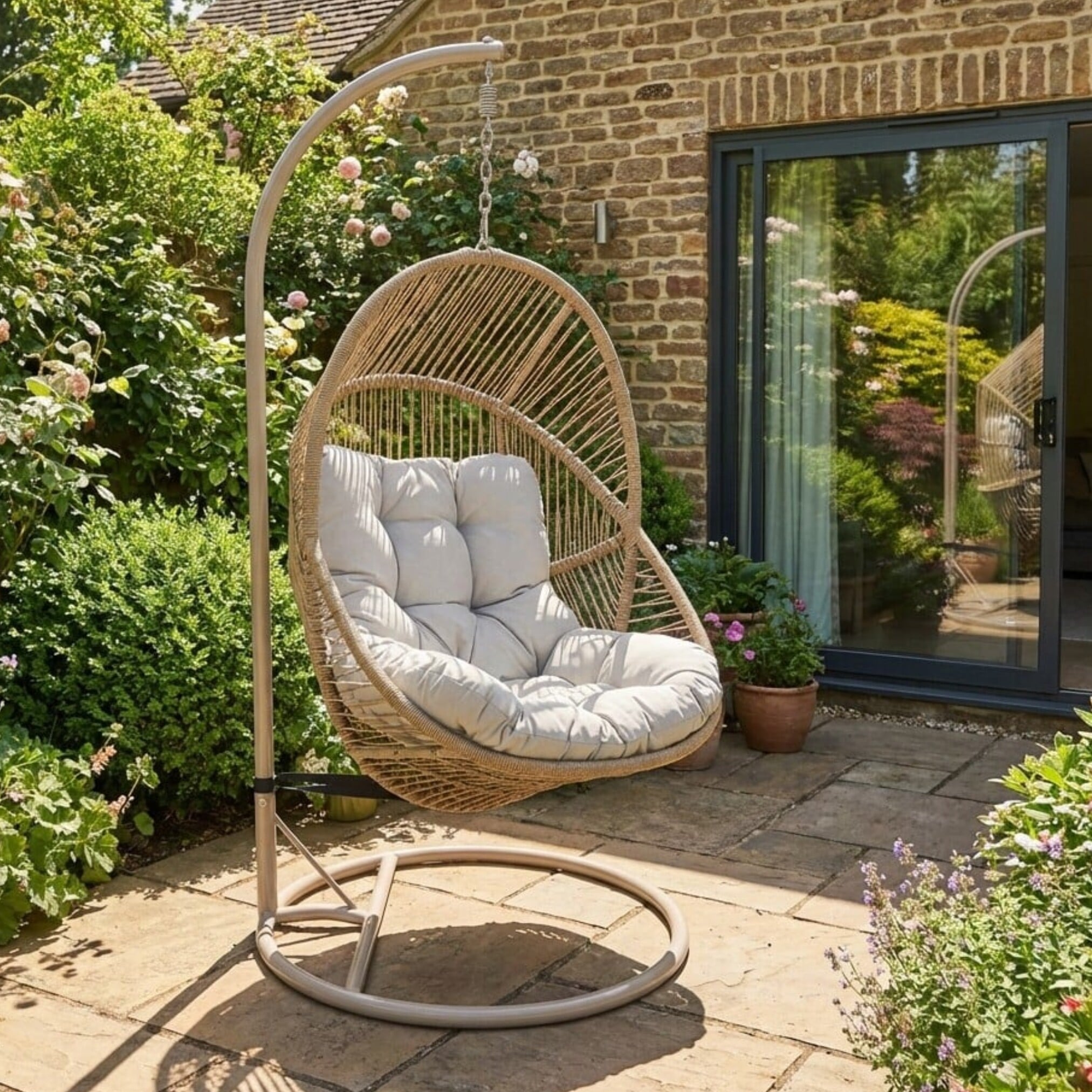 Experience ultimate relaxation with our elegantly designed garden hanging chair, crafted to blend style and durability seamlessly. Constructed with a robust steel frame, this chair ensures stability and longevity, while the handwoven, weather-resistant PE wicker adds a touch of rustic charm. The inviting cushions, generously filled with luxurious polypropylene cotton and encased in resilient 100% polyester fabric, offer exceptional comfort and support for your outdoor lounging needs. Ideal for enhancing patios, balconies, or secluded garden corners, this hanging chair transforms any space into a cosy, inviting retreat, perfect for unwinding and enjoying the soothing sway amidst the refreshing outdoor ambiance.
