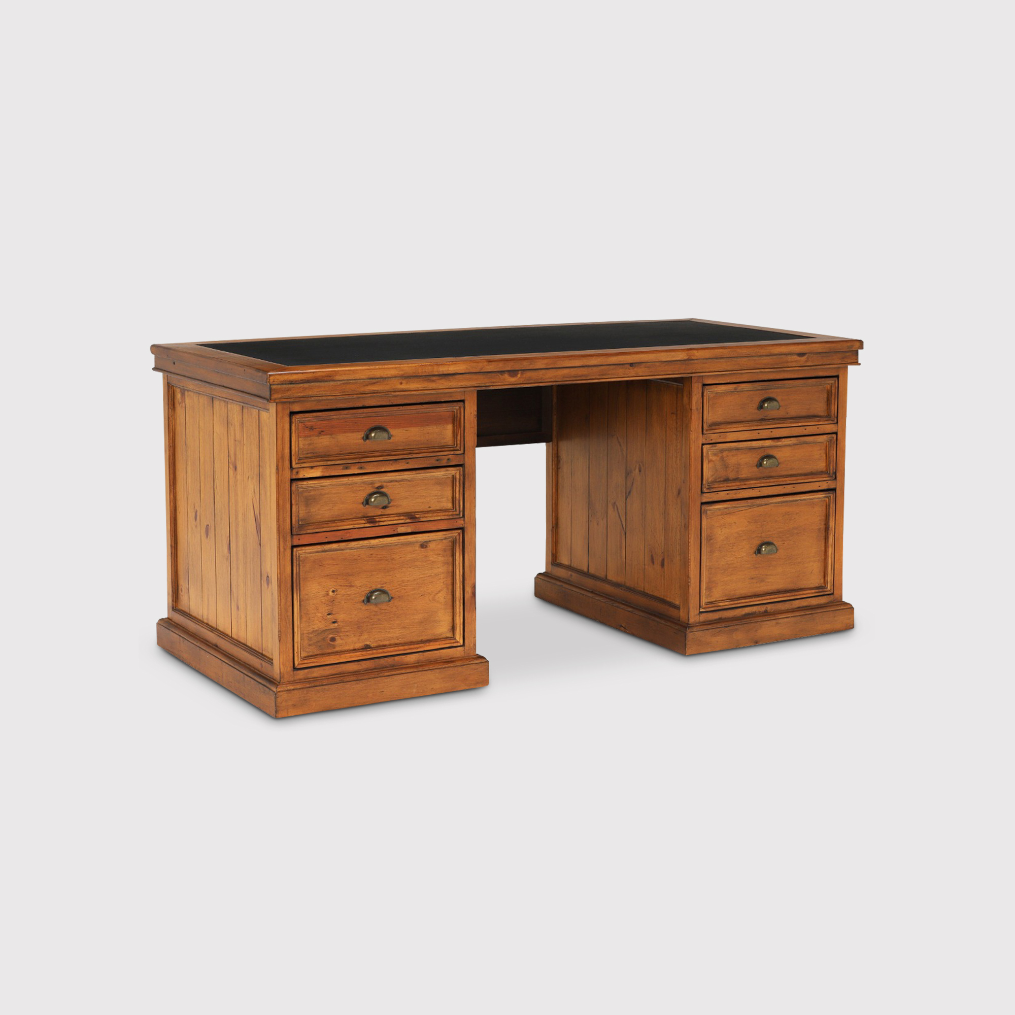 Introduce a touch of sophistication to your home office with the Villiers pedestal desk, a standout piece from the exquisite Villiers range. Expertly crafted from recycled and reclaimed wood, this desk exudes a timeless 'old world' rustic charm that effortlessly enhances any workspace. Made from Eastern white pine, it beautifully showcases the elegance of repurposed materials, making it a unique and eco-friendly addition to your office environment. With six generously sized drawers, this desk not only offers ample storage but also enhances functionality, allowing you to organize your essentials with ease while promoting sustainability in your workspace.