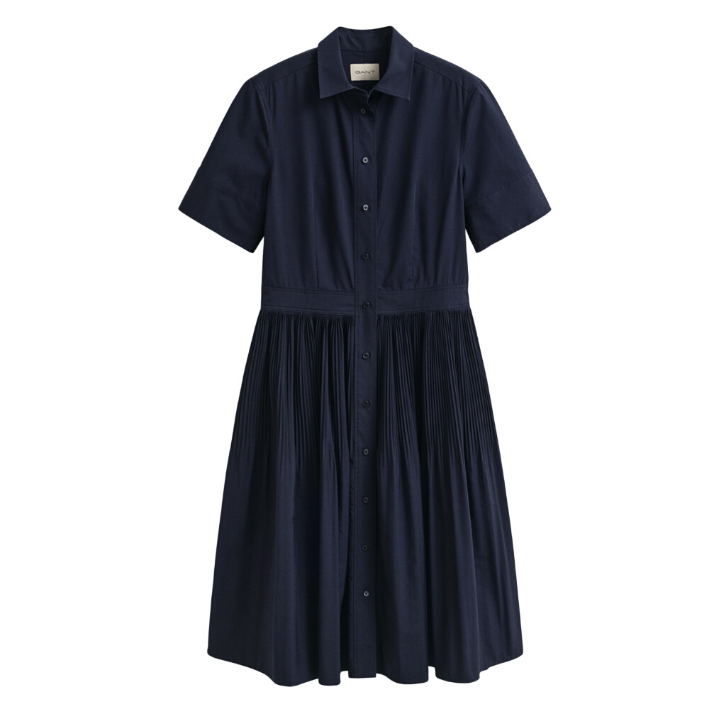 Crafted from premium cotton, this shirt dress combines classic shirting elements with a refined silhouette. Designed for a regular fit and falling below the knee, it features a point collar, short sleeves, and a centre-front placket with recycled polyester buttons. The look is completed with a pleated A-line skirt, subtle gathers at the waistband, and darts at the front and back for added structure.