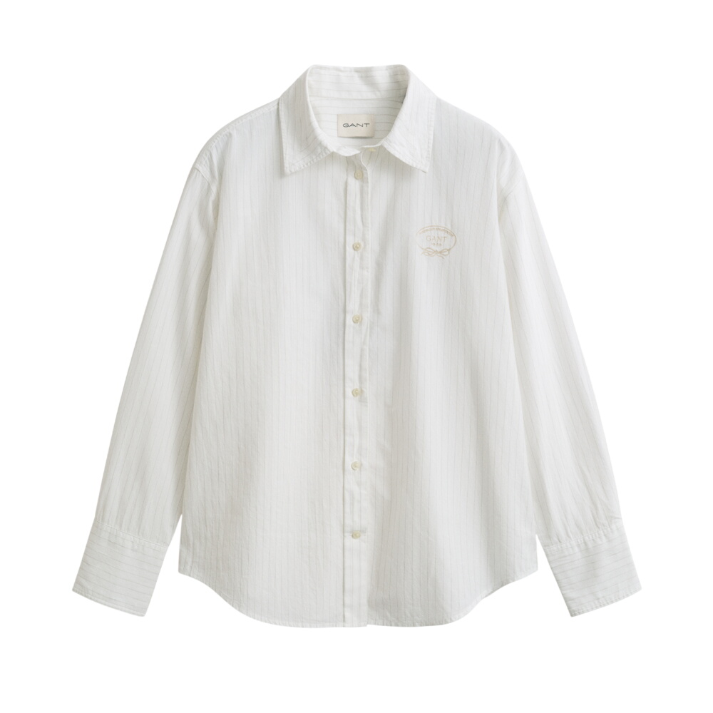The shirt is designed for a relaxed fit and crafted from premium cotton that has been garment-washed for a soft hand-feel. Featuring yarn-dyed stripes created in-house, it includes a point collar, a curved hem, adjustable sleeve cuffs, and a seasonal tonal Gant graphic embroidery at the chest. This shirt is designed for a relaxed fit, but if you prefer a closer fit, we suggest sizing down.