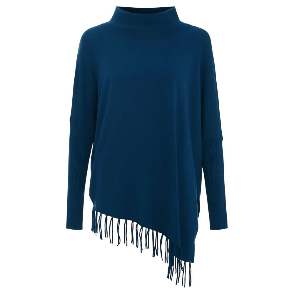 The ultimate seasonal layering piece. This poncho inspired knit in a bright blue shade is updated with fringe detailing at the asymmetric hem for a contemporary edge. Finished with a soft cowl neck and skinny ribbed sleeves, this knit is perfect for wearing through the year with your favourite trousers.