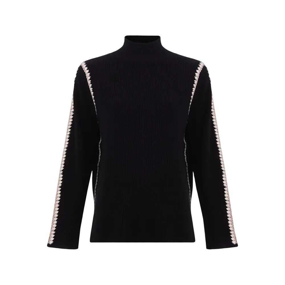 This black knitted jumper will be a constant companion in the new season. With a luxuriously weighty hand feel it’s updated with crochet stitch detailing for a modern edge. Dress up with smart trousers or down with your favourite denim for versatile everyday styling.