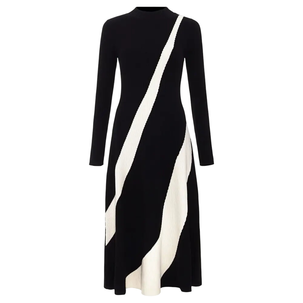 This black knitted dress deserves a place in every wardrobe. In a soft ribbed texture, it’s updated with a white swirl print for a stylish contrast. Flowing to a flared midi silhouette we love to style ours with boots for a look that will take you from desk to dinner or drinks.