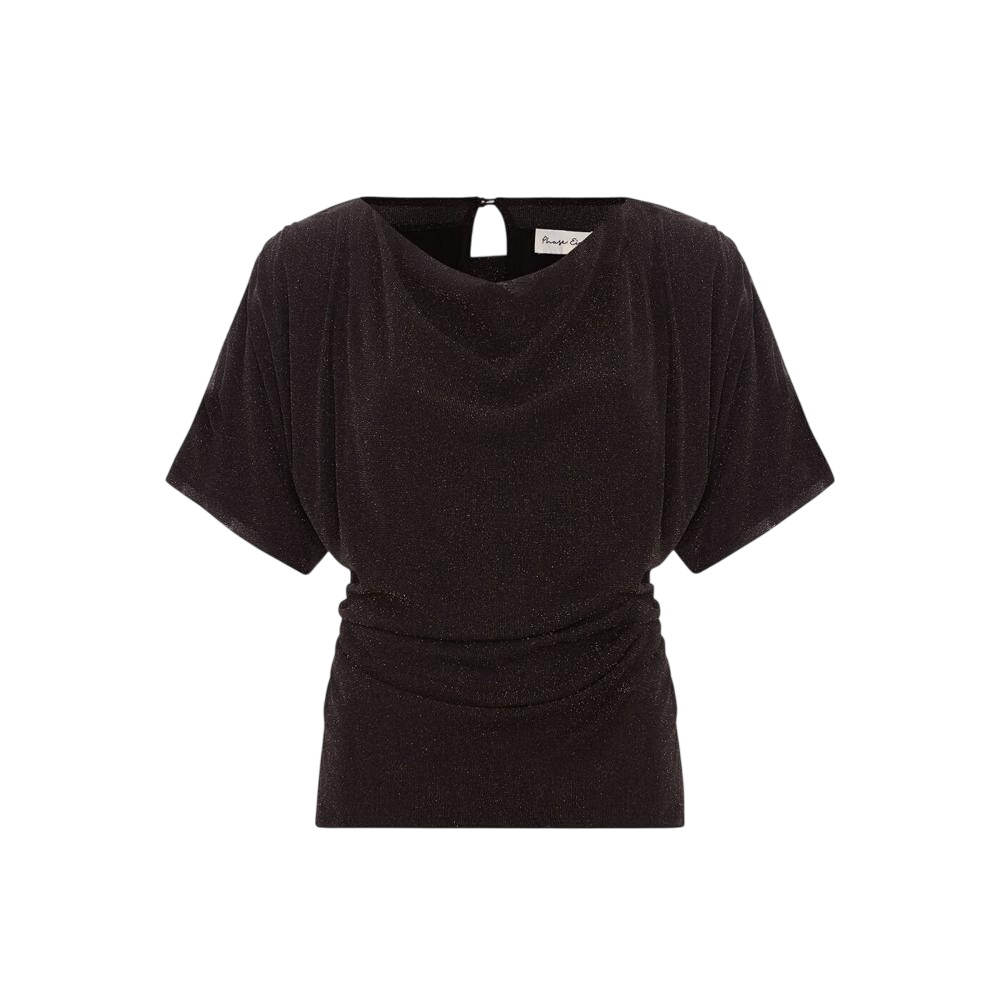 Every wardrobe needs a go-with-everything evening top. Featuring a modern slash neckline, a sophisticated draped silhouette and specks of bronze shimmer to catch the eye. This versatile style can be worn with trousers or skirts for an effortless but high-impact evening look.