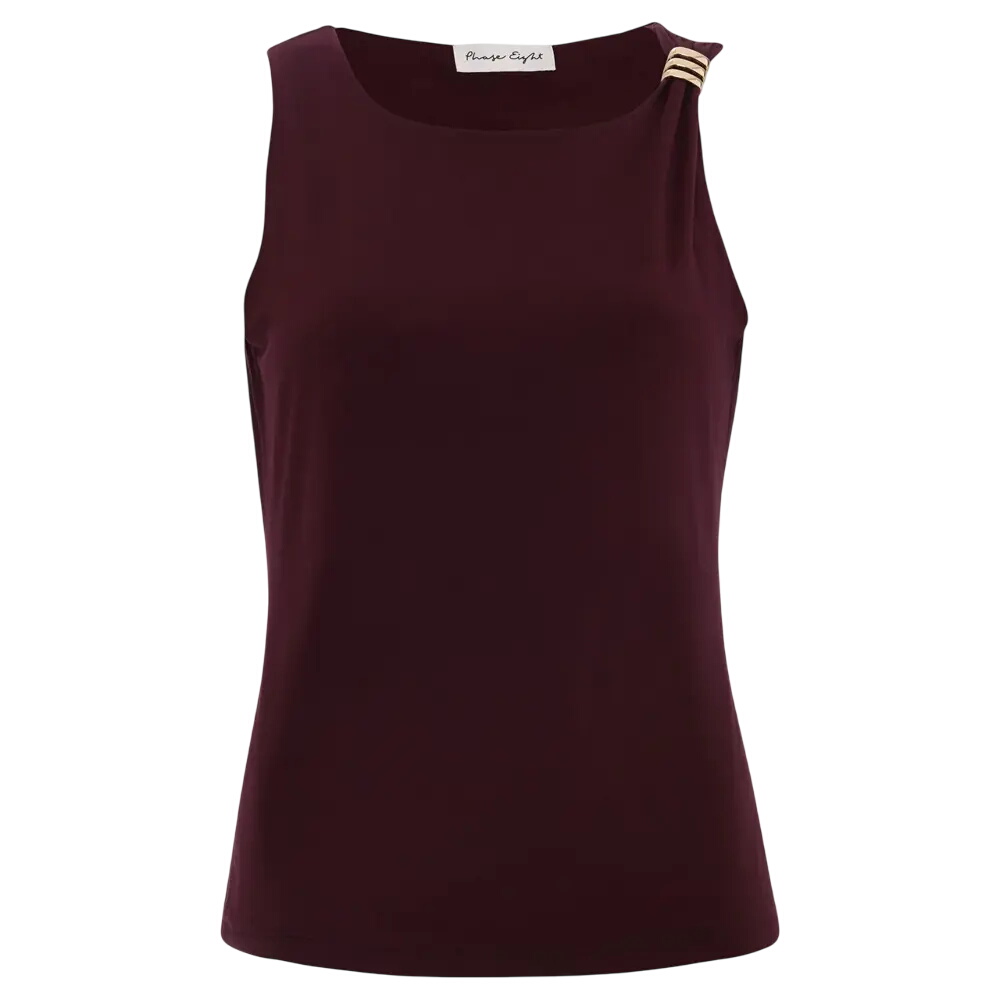 Say hello to your new versatile evening style. This deep burgundy sleeveless top features asymmetric shoulder straps with modern gold detailing, adding a luxe touch to the minimalistic design. Style with wide-leg trousers and heels to finish off the understated, cool look.