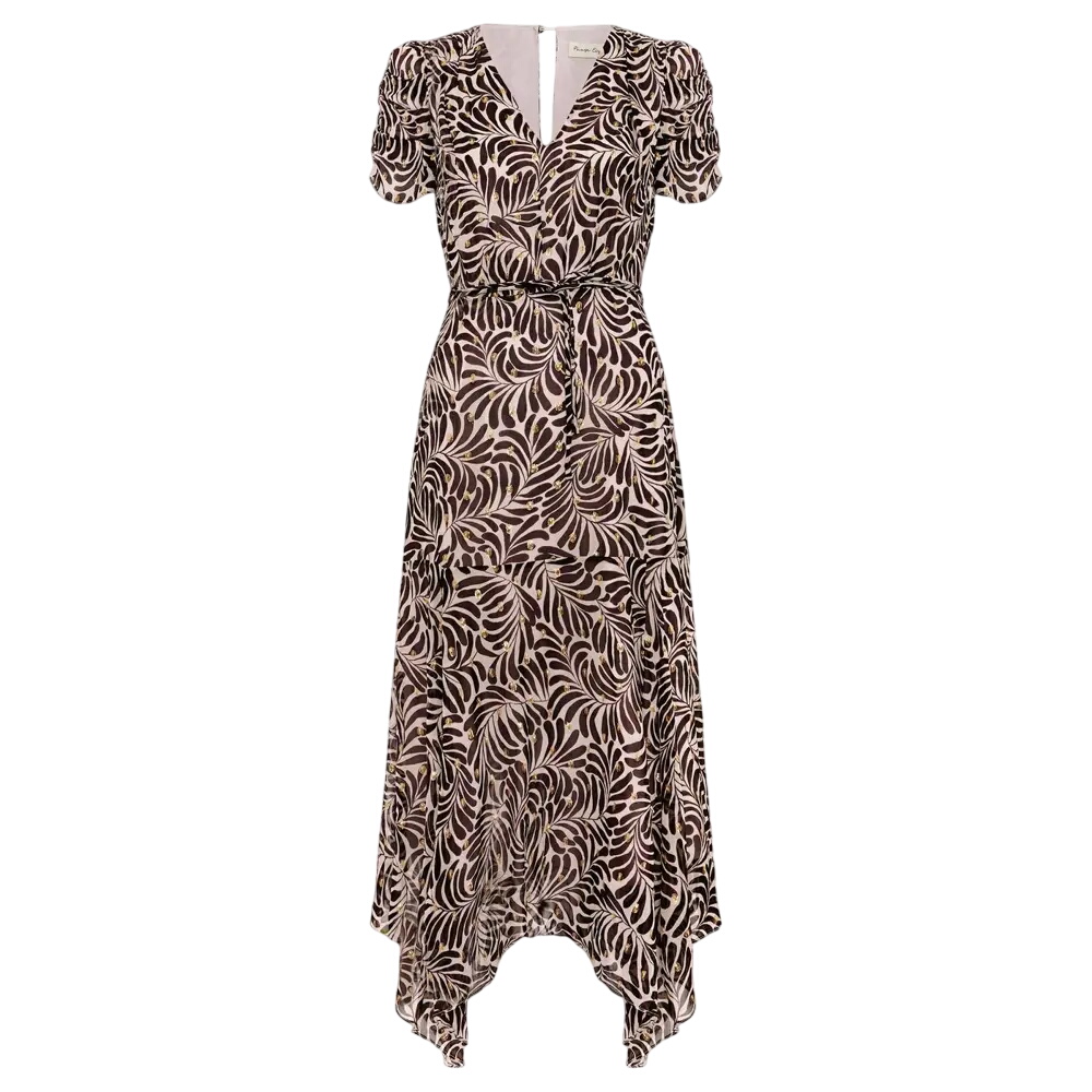 Embrace elegant print and soft shimmer with our Verity dress. This midi dress has feminine ruched short sleeves, a modern V neckline and a tie belt for enhancing the romantic shape. Featuring a contemporary asymmetric hemline to add fluidity to the silhouette, with flecks of gold detailing that catches the light as you move. Style with heels and a clutch for a look perfect for all your upcoming events.