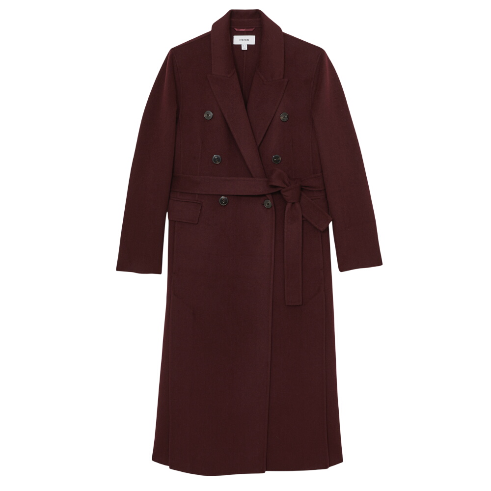 The Brogan Burgundy coat is tailored from a soft, double-faced wool blend with blind seams and no lining for a smooth, premium feel throughout. Its clean double-breasted silhouette is finished with a matching self-tie belt and flap welt pockets.