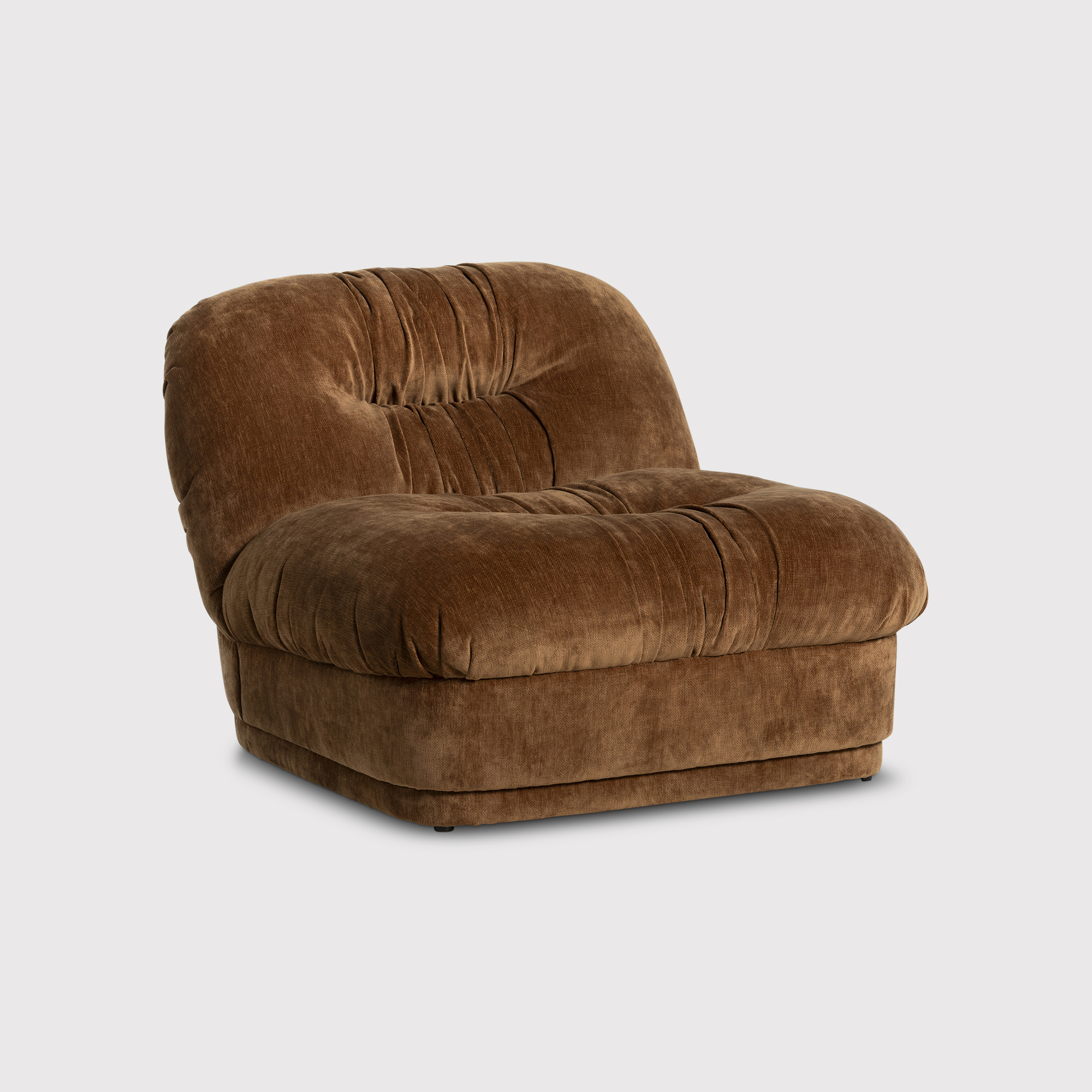 Experience a perfect blend of retro charm and contemporary comfort with the Nicolo Brown Fabric Armchair. This beautifully designed piece features a low-slung profile, rounded edges, and exquisite tufted detailing, offering a welcoming and relaxed seating option. Wrapped in luxurious velvety fabric, it brings an element of warmth and a soft, tactile dimension to any room. The armchair's generously cushioned base and backrest ensure optimal comfort, making it an ideal choice for reading, lounging, or creating a serene corner in your home. With its sculptural elegance and adaptable design, this armchair seamlessly complements any space, whether as a standout feature or as part of a modular seating arrangement.
