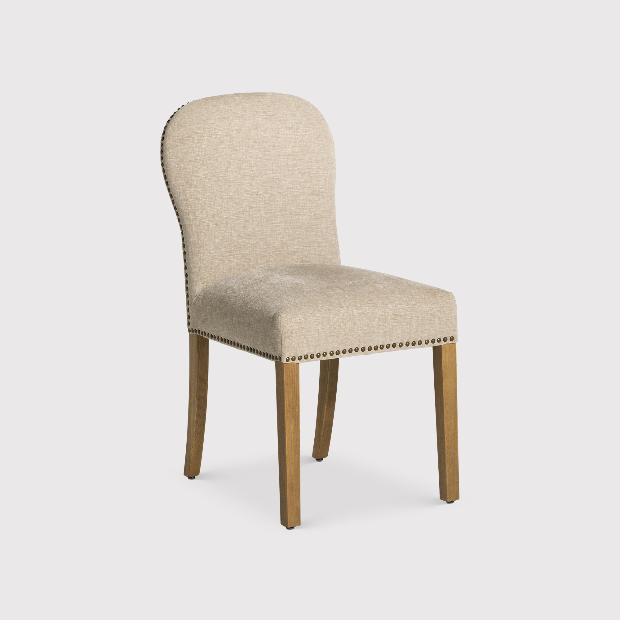 Transform your dining area with the Gable Dining Chair, a perfect blend of elegance and comfort. Upholstered in luxurious beige chenille fabric, this chair adds a touch of sophistication to any setting. The seat is thoughtfully designed with a combination of foam and fibre filling, ensuring superior support and comfort. Its foam-filled backrest is crafted to maintain its shape, providing enduring comfort. The chair's light-toned solid oak legs not only enhance its natural allure but also guarantee robust strength. Adding to its classic appeal, each chair is adorned with individually hand-hammered studs, showcasing a dedication to timeless style and meticulous craftsmanship.
