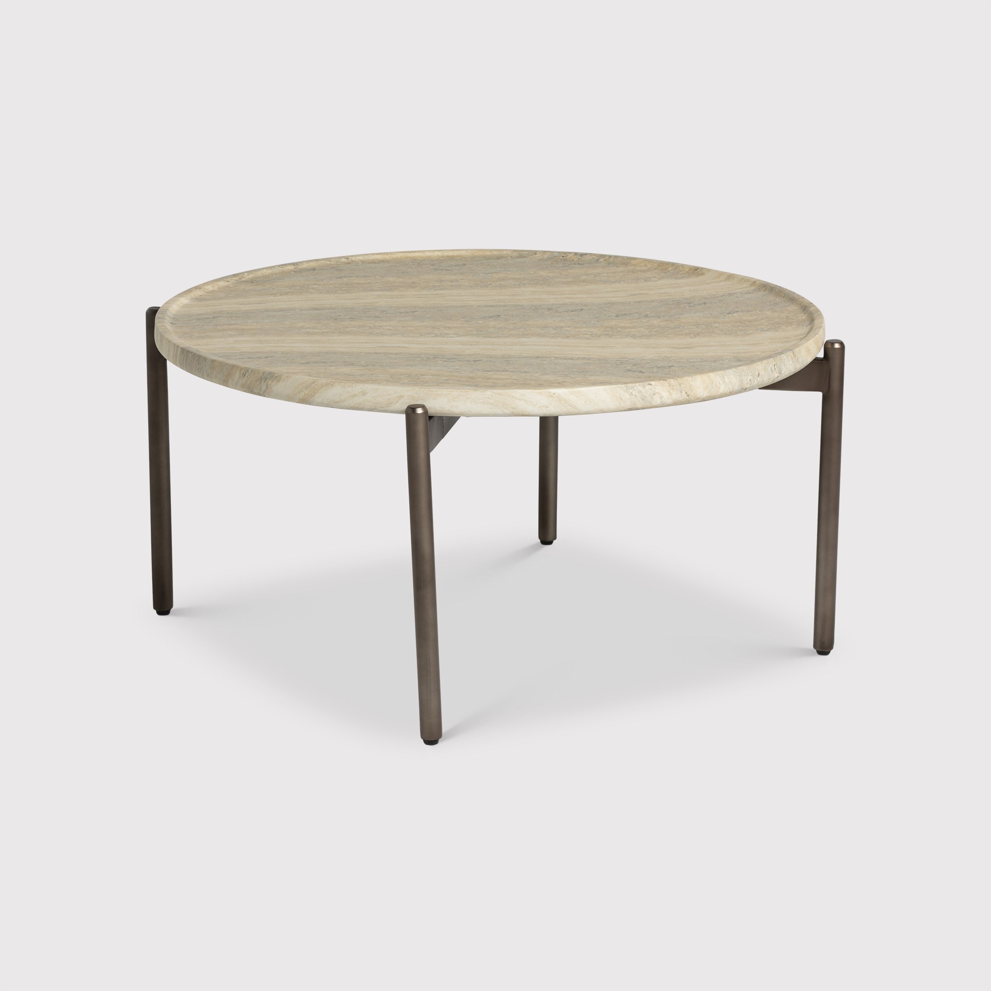 Discover the charm of this exquisite coffee table, featuring a faux travertine top that boasts a stunning natural stone-like finish. The top is gracefully supported by robust chocolate brown legs, offering both stability and elegance. Ideally crafted for indoor use, this table seamlessly transitions into a garden setting, infusing any space with warmth and sophistication. Its generous surface area is ideal for showcasing decorative pieces, serving drinks, or establishing a cozy gathering spot. With its timeless earthy tones and versatile design, this table is a perfect enhancement to both modern and classic interiors, adding an effortless touch of elegance to your home.