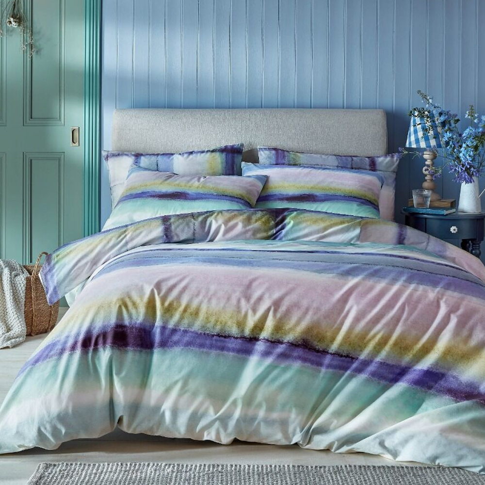 Reminiscent of the beautiful beaches on the Hebridean islands of Scotland, ‘Hebrides’ is a bold and beautiful watercolour stripe design full of colour. Turquoises and blues are evocative of the colours of the sky and sea, it’s our Bluebellgray take on a seascape. The same Scottish hues are used to create a watercolour tartan reverse - a special design that celebrates our own Scottish roots and the textile heritage of Scotland. This design is a larger scale, modern, watercolour interpretation of traditional tartan, blending heritage with our signature style to bring a fresh, artistic twist to an iconic pattern. This bedding is made from 100% cotton 200TC percale giving a smart, matte and crisp finish