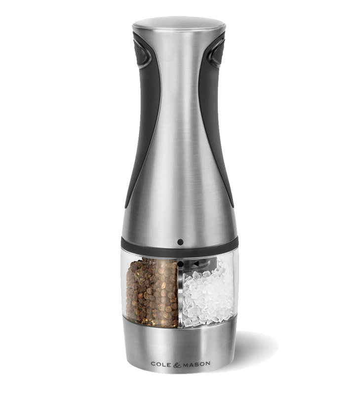 A lovely 2 in 1 salt grinder and pepper mill with a contemporary styling in brushed chrome and crystal clear acrylic. Very tactile and easy in the hand push button operation either side makes this mill perfect for operating with one hand, ideal for seasoning while cooking.