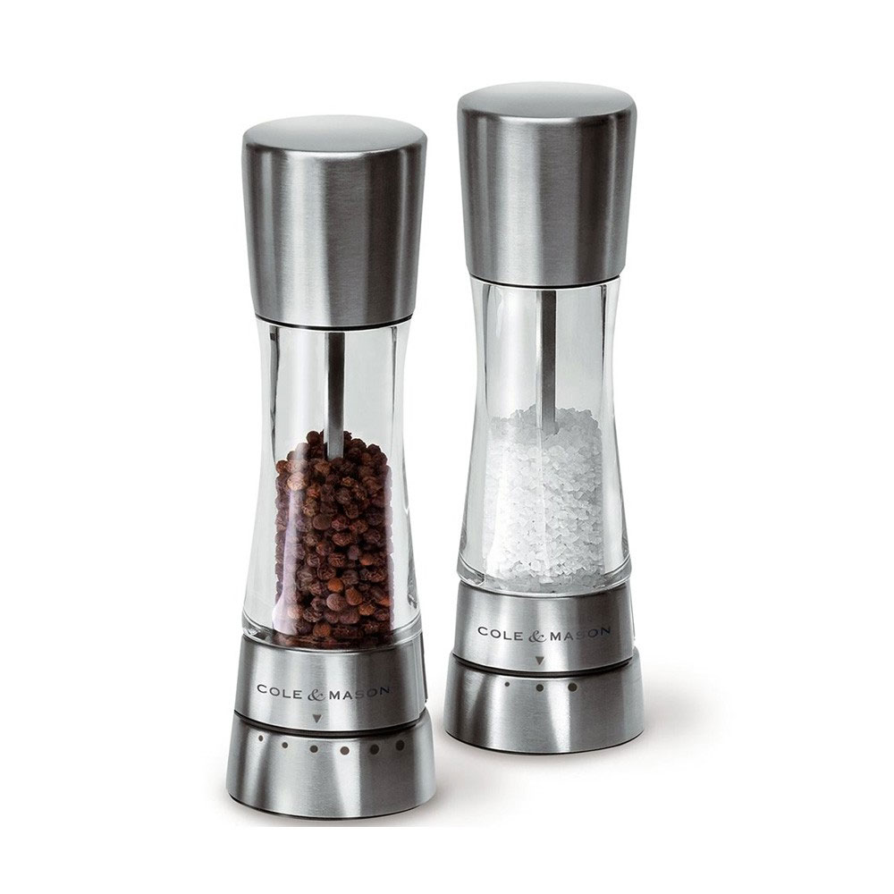 As one of our most well known and best loved Gourmet Precision mills, the Derwent salt and pepper mills with its sleek profile in stainless steel and acrylic brings professional seasoning and control to everyday kitchens. Simply twist the stainless steel collar on the Derwent mills to 6 pre-selected settings for pepper and 3 for salt to achieve fine to coarse grinds during and after cooking; use a coarse grind for steaks, a mid setting for pizzas and a fine setting for soups and sauces. Each mill features a push top cap for ease of refill and is presented in a beautiful gift box. The Cole & Mason award winning Gourmet Precision mechanism does not crush peppercorns but strips them to consistently release the maximum amount of flavour with each turn. These mills feature a hardened carbon steel mechanism for pepper and diamond sharp ceramic mechanism for salt and come with a lifetime guarantee.