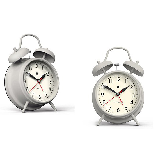This retro-styled Newgate New Covent Garden Alarm Clock with metal case and hammer-bell alarm is finished in matte overcoat grey.