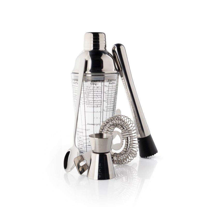 - Glass Cobbler cocktail shaker with recipes, ice strainer, muddler, bar spoon & double jigger