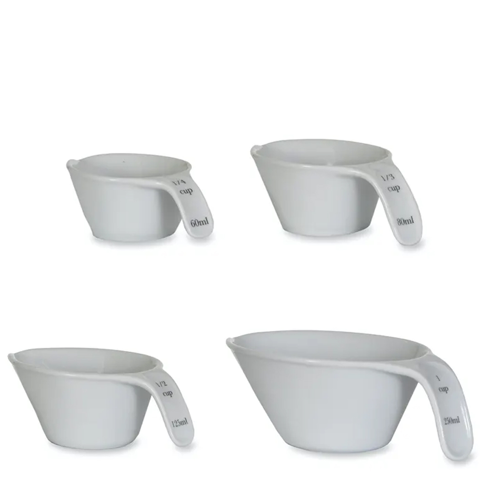 - Capacities: 250ml/1 cup, 125ml/1/2 cup, 80ml/1/3 cup and 60ml/1.4 cup
