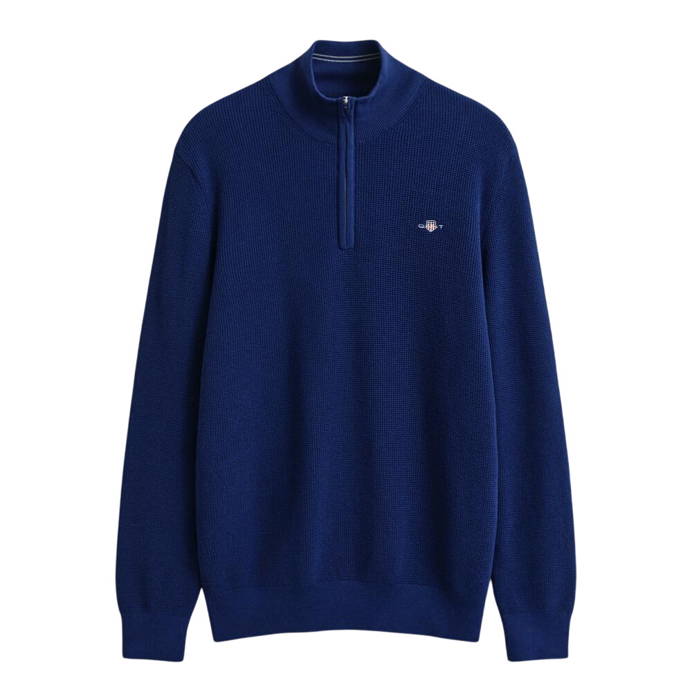 This Gant sweater is made from an organic cotton blend and features a subtle waffle-knit texture. Designed for a regular fit, it includes a half-zip collar ribbed cuffs and hem, and shield embroidery at the chest for a signature finish. This product is made with a majority of organic cotton. Organic cotton reduces the environmental footprint and promotes safe work and better livelihoods.