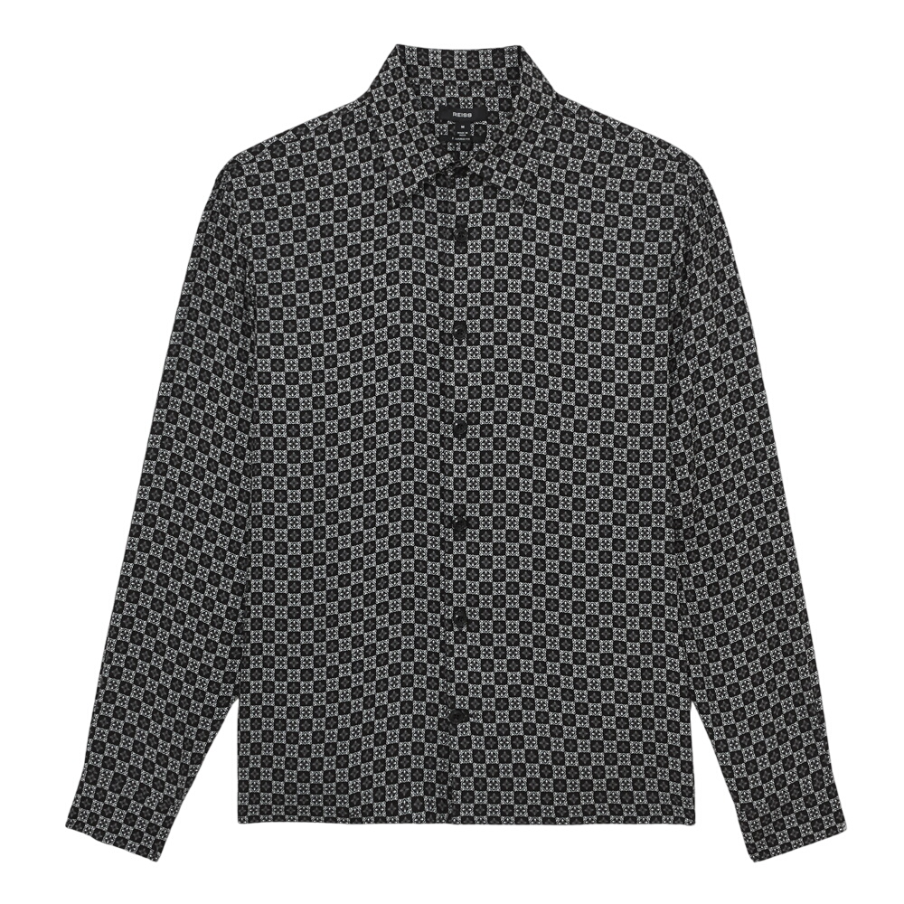 The Nix black shirt is patterned with a checkerboard-style medallion print, creating a bold yet refined statement for evening looks. It’s finished with a classic collar, French placket, and buttoned cuffs.