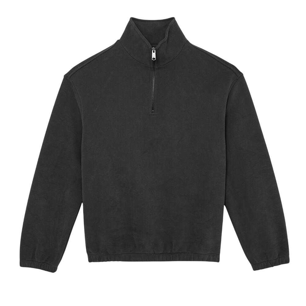 The Washed Black Quinn sweatshirt is crafted from midweight brushed jersey with a soft fleece-back finish. It has a funnel with a half-zip, and an elasticated hem and cuffs.