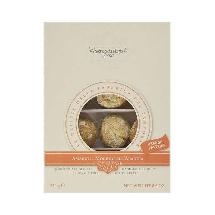 Amaretti all'Arancia are the confectionery product obtained from the craftsmanship of a dough made from excellent raw materials including almonds, egg white, sugar, candied orange paste, honey; the sweets are manually formed and then baked in the oven. They are then packaged.