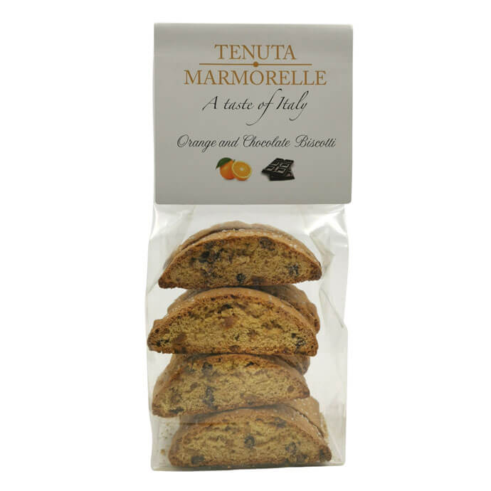 The cantucci contain pieces of candied orange peel and chocolate chips and are lovingly made in Tuscany.