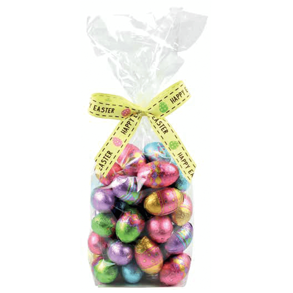 A bag of foil wrapped chocolate eggs that are perfect for the garden Easter egg hunt!