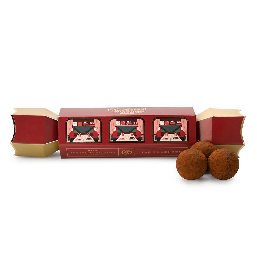 A beautiful Christmas cracker filled with three Milk Chocolate Truffles, each one with a creamy Madagascan Vanilla centre, a generous coating of Milk Chocolate and lightly dusted with cocoa powder. A journey of chocolate making history over 150 years, delight in the train carriage illustrations as Madame Charbonnel and Mrs Walker travelled from Paris to London to open their very first store on London’s exclusive Bond Street.