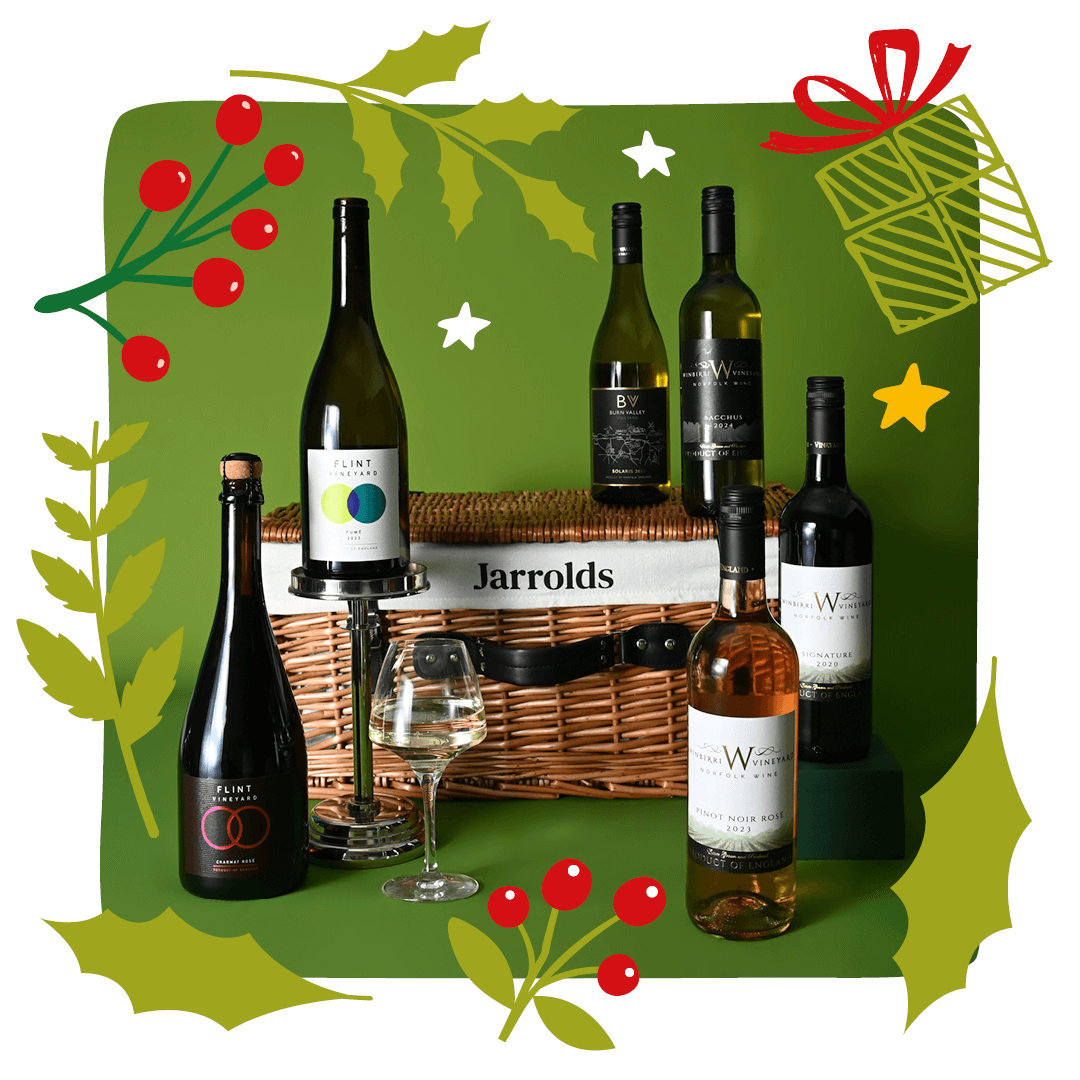 A delightful collection of six local wines nestled into our signature Jarrolds wicker basket. We've included Winbirri's iconic Pinot Noir Rosé, Bacchus and their Signature Red, along with Flint Vineyard's white Fume and sparkling Charmet. Plus a delightful bottle of Solaris from Burn Valley Vineyard.