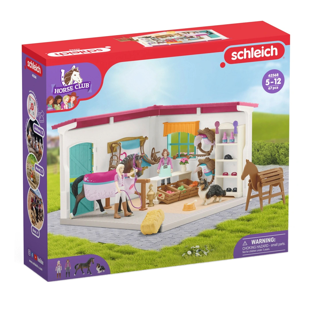 Ding-dong! Customers are arriving at the Schleich Horse Club riding store. What special treat will you pick up for your horse? Horse feed, saddles, brushes...this tack store has everything! There's even a friendly dog to help you find what you need. Load up your pack, then it's time to head back to the stables... sorry, you can't escape your stable chores by shopping all day.