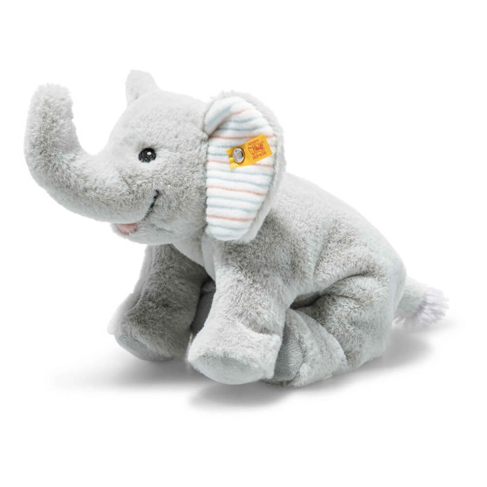 Steiff's little floppy Trampili elephant is a sweet friend for children. The elephant is 20 cm tall and its fur is made of cuddly soft plush. Trampili likes to cuddle in bed and is up for fun with everyone. Granulate bags in the stomach ensure a great feeling experience and the rustling of the granulate beads calms the children.