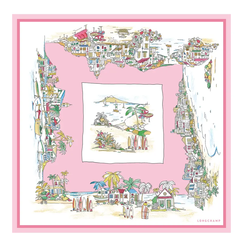This print reveals a scene that captures the spirit of summer. Longchamp surfboards line the beach, surrounded by palm trees, umbrellas, beach huts, boats, and sails—all set on golden sand facing a bright, blue sea.