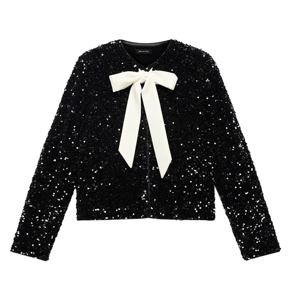 - Black sequin jacket featuring a crew neckline, long sleeves and contrast bow fastening through the front.